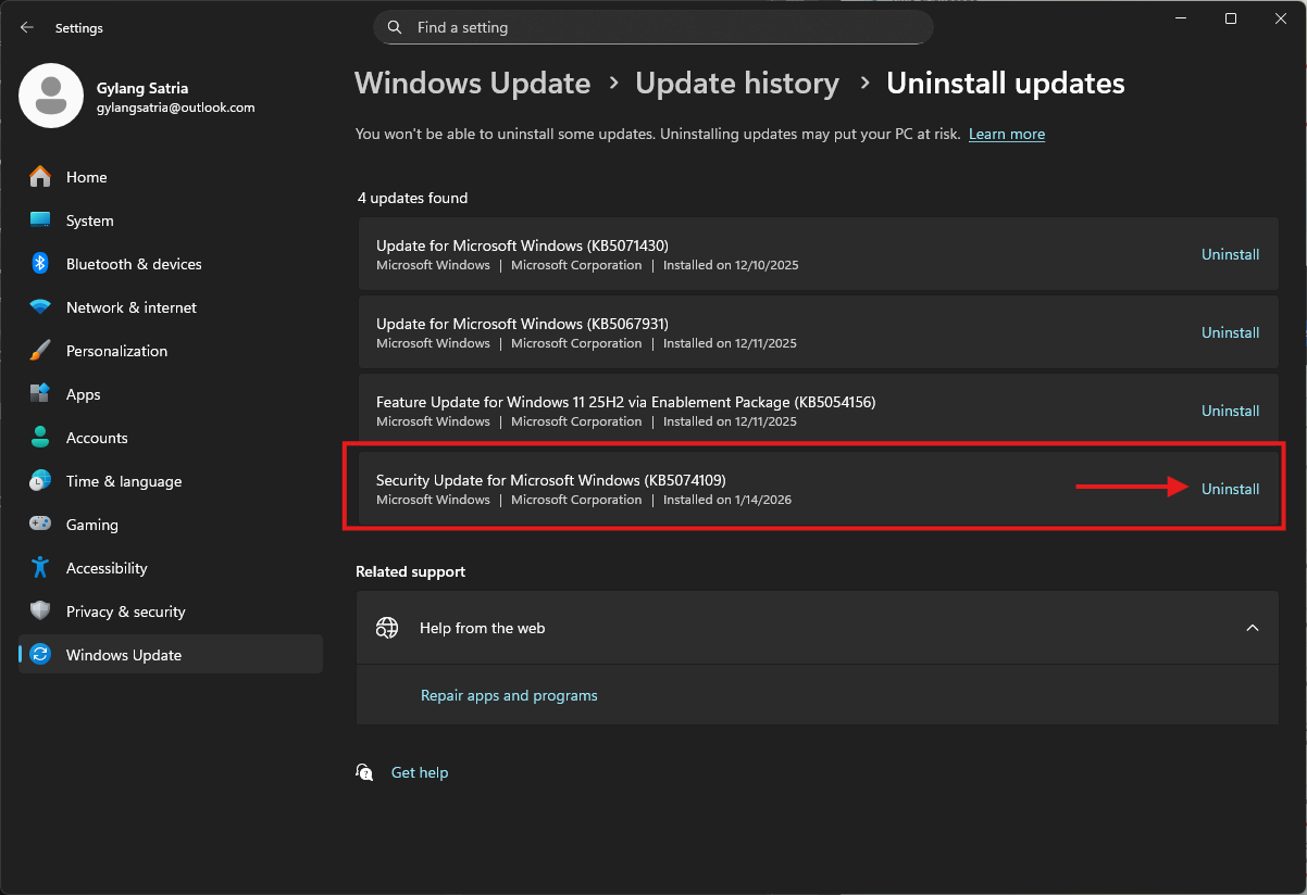 Jika kamu merupakan pengguna yang terdampak kendala, kamu bisa mencoba menghapus update KB5074109 dari sisitem kamu dengan mudah.