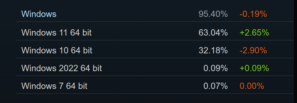 Meskipun Valve belum berencana menghentikan dukungan untuk Windows 10 sepenuhnya, seperti yang telah dikabarkan sebelumnya mereka akan segera mengakhiri dukungan untuk versi 32-bit dari sistem operasi Windows 10. Dari survey tersebut ada hal menarik nih, dimana ada sistem misterius “Windows 2022 64-bit” muncul di posisi ketiga dengan 0.09%, dan Windows 7 tetap bertahan di posisi terakhir dengan 0.07%.