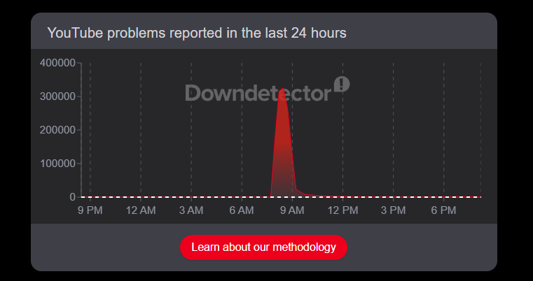 Nah berdasarkan data dari Downdetector, terdapat 321.958 laporan masalah YouTube di Amerika Serikat yang tentu terjadi juga di Indonesia dan mayoritas negara lain di dunia. Gangguan tersebut juga berdampak pada layanan lain, dengan 8.923 laporan untuk YouTube TV dan 2.694 laporan terkait Google dalam waktu yang hampir bersamaan.